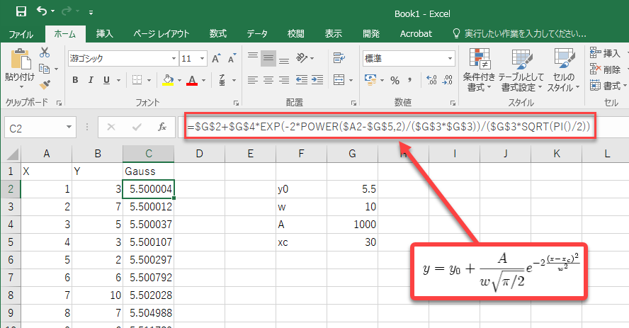 Excelでフィットを行う場合には、変数セルや目的セルなど事前に準備するものがいくつかあり手間がかかりますが、Originでは元データ(もしくはグラフ)があればそのままフィットに使う関数を選択してフィットを実行できます。ここでは同じデータに対してフィットを行う手順をOriginとExcelで比較してご紹介します。今回はOriginに標準で組み込まれているGauss関数でフィットさせる場合の手順を比較します。