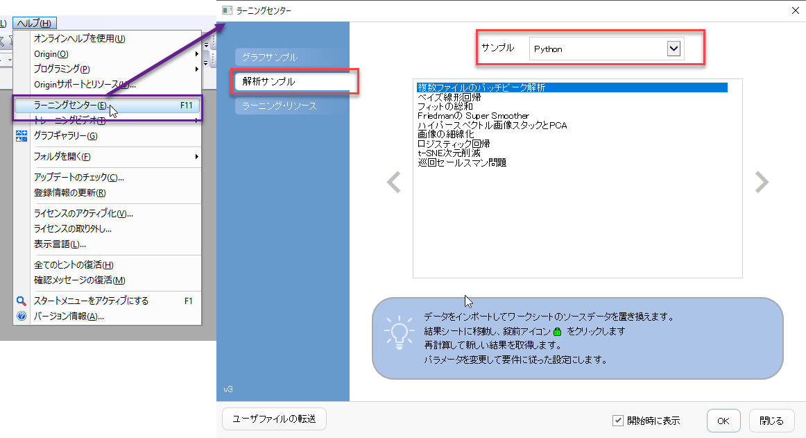 Pythonを使ったサンプルコードを確認したい場合には、Originを起動してメニューの ヘルプ>ラーニングセンター 内から、「解析サンプル」の「Python」の項目をご覧ください。