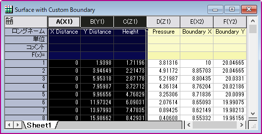 またはOrigin2018の Origin Centralのグラフサンプルから「3D曲面図:Surface with Custom Boundary」を開くとこのデータが表示されますのでご利用ください。