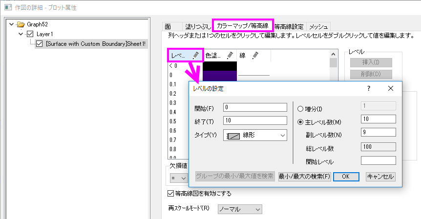 続いて、「カラーマップ/等高線」タブにて「レベル」をクリックし、次のように設定します。また、「色塗り」は”Spectrum”を選択します。