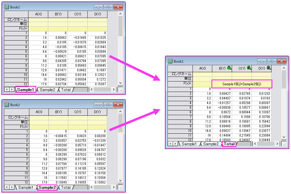 このページでは例として、2つの測定データを合算するため「Total」シートのB・C・D列で「Sample1」シートと「Sample2」シートのB・C・D列を参照する方法をご紹介します。