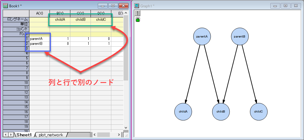 Origin2021bより追加されたグラフ形式、ネットワークプロットは元データの書き方が少し特殊です。今回はそのデータの書き方3つをそれぞれご紹介します。