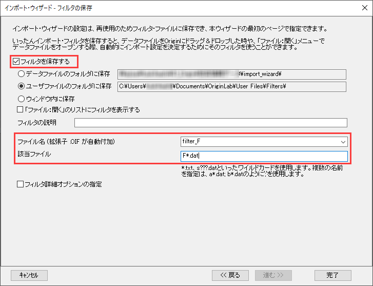 「該当ファイル」では、保存したフィルタを適用するファイル名の指定ができます。上図のように「F*.dat」と指定した場合、「Fから始まる拡張子.datのファイルに対してこのフィルタを適用します。