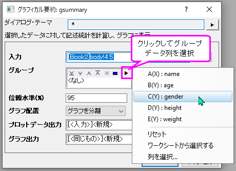 Origin 2026 では、新たに「グラフィカル要約」機能が追加されました。この機能は、データを視覚的に簡潔にまとめ、重要な要点を迅速に理解するためのグラフやチャートを自動で生成します。グループ情報があるデータではグループ化も可能なので、変数ごとの比較はもちろん、グループごとの比較も簡単に行えます。