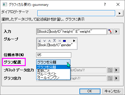 グラフィカル要約のダイアログではグラフ配置の設定が可能です。これにより、変数ごと、またはグループごとの比較がしやすくなります。ここでは選択したオプションによりどのような表示になるかをご紹介します。
