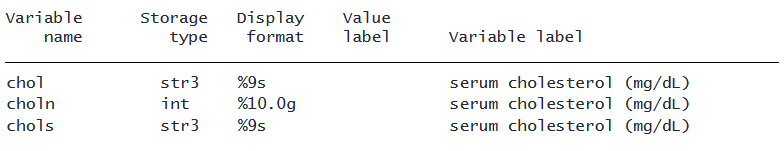 出力には 0 個の観測値が表示され、平均、標準偏差、最小値、最大値は空です。 これが、chol が文字列変数として保存されている可能性があることを示す最初の手がかりです。 これは、データを記述することで確認できます。