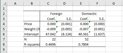 . collect label levels result _r_b "Coef.", modify. collect label levels result _r_se "S.E.", modify. collect preview