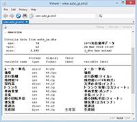 右にあるdescribeの実行結果をご覧ください。ちなみに、これはauto.dtaのものです。日本語があったので、違和感を覚えた方もいることでしょう。つまり、Stata 14では新たにユニコード(Unicode)をサポートしましたので、日本語が利用できるようになりました。