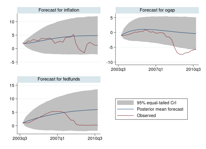 動学的予測は、VARモデルなどの多変量時系列モデルをフィットした後によく用いられる予測手法です。従来のvarコマンドでは推定後に、fcastで動学的予測が可能でした。新しいbayes: varコマンドでは、ベイジアンVARモデルにフィットした後でbayesfcastでダイナミックなベイズ予測を行います。