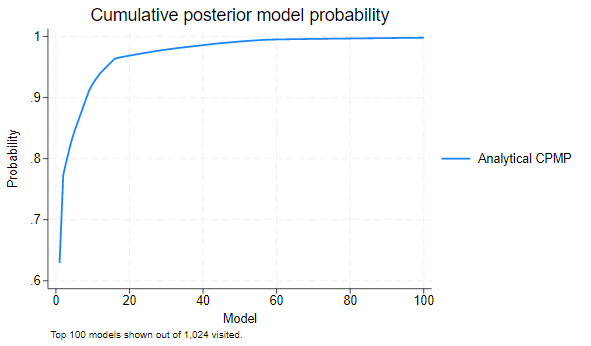 10の予測変数とデフォルトのg事前分布では、bmaregressは想定し得る全モデル、210=1,024個を探索します。