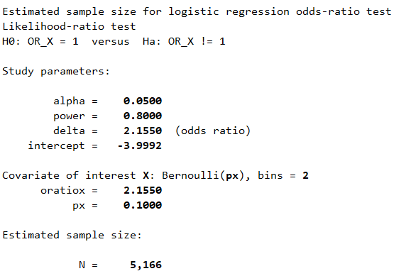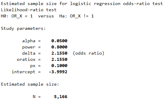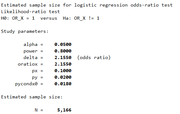 . local b0 = r(intercept). power logistic 2.155, px(0.1) intercept(`b0')
