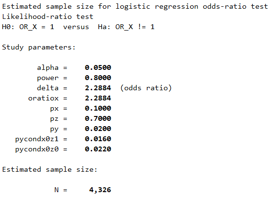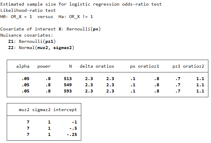 . power logistic 2.3, x(distribution(bernoulli 0.1)) z1(distribution(bernoulli 0.7) oratio(0.8)) z2(distribution(normal 7 1) oratio(1.1)) intercept(-1 -.5 -.25)