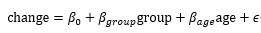 Xはデザイン行列、β=(β_0,β_group,β_age)'は係数のベクトルです。