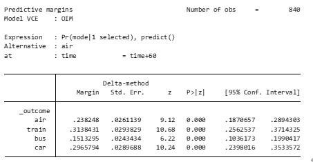 フィット後にmarginsコマンドを実行すると、各交通手段を選択する平均予測確率が得られます。