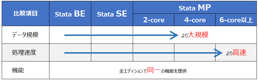 Stataには、取扱うデータの規模と計算する処理速度の異なる3つのエディションがあります。