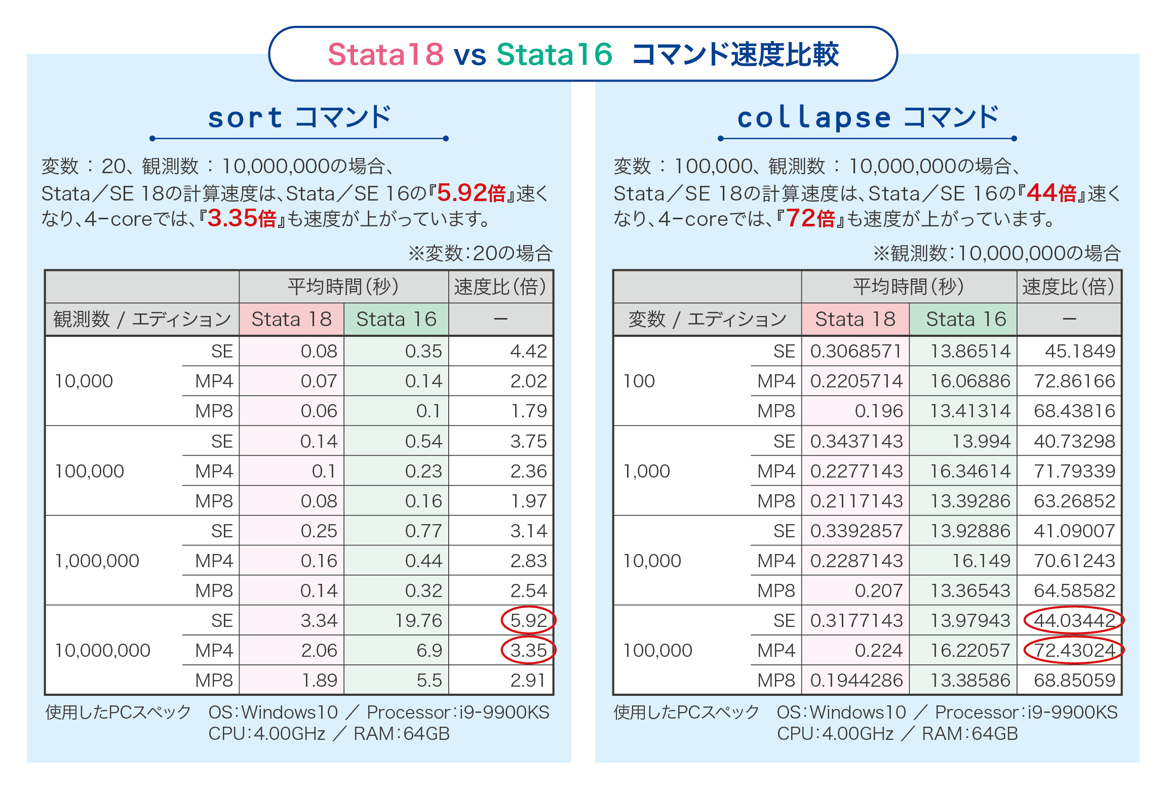 sortおよびcollapseコマンドのアルゴリズムが見直されました。多くのコマンドではデータの並び替え処理(sort)や要約統計量の計算(collapse)が使われているため、最新のStataの多くのコマンドの処理速度の高速化しています。