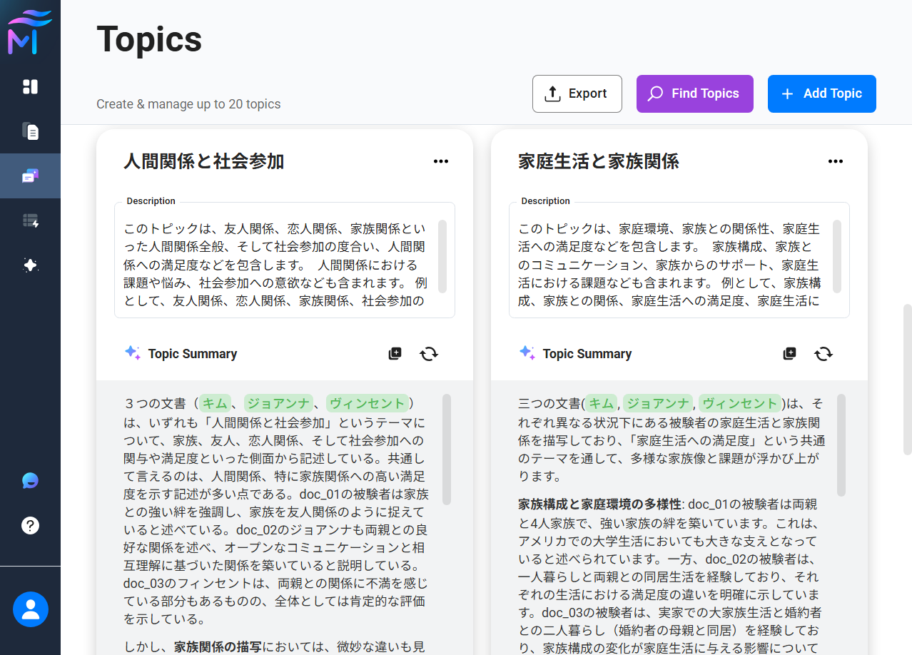 ※現状日本語は未対応ですが、自動分析が主のためメニューボタンはごく少なく、直感的に操作できます。任意のトピックを探索させる際の指示や、AIチャットでは日本語を使用できます。